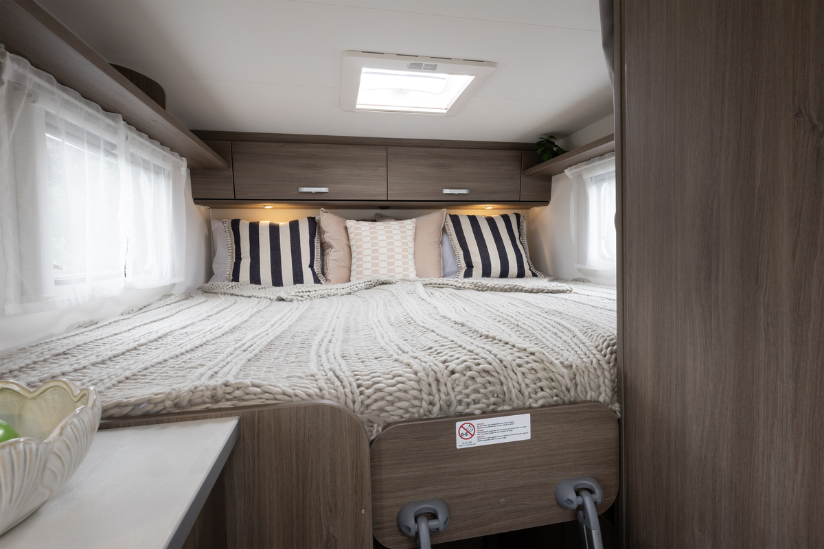 | Beds | Fixed beds in rear (200 × 70 / 195 × 80 cm) with high quality mattresses and slatted frames • Conversion to king bed (200 × 195 cm) |