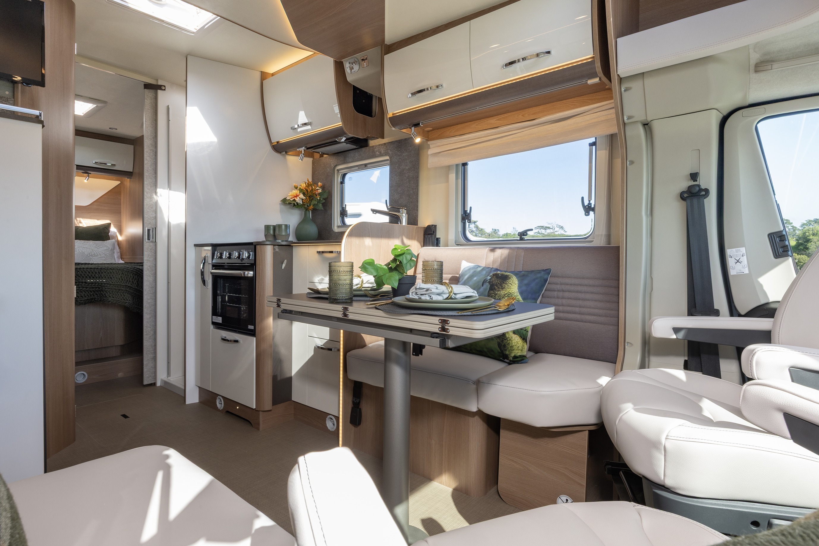 The lounge table can be adjusted in position and size to suit whatever’s happening at the time. The toilet door can also divide the motorhome into two separate rooms, giving the rear bedroom both privacy and extra space.