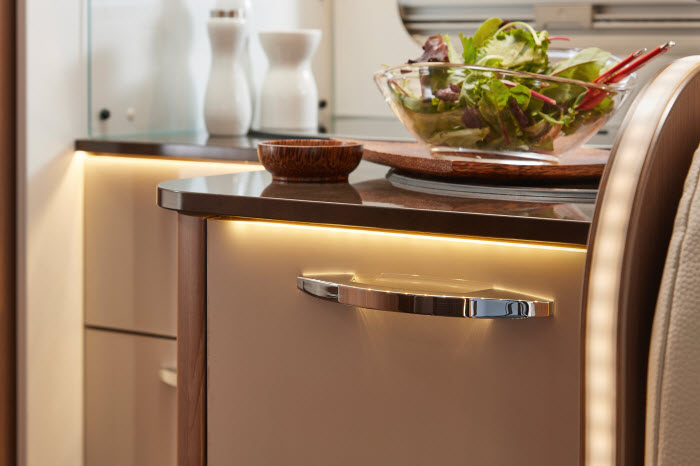 In the interior of the motorhome, a couple of features that distinguish a motorhome in the mid range from entry level are upholstery, storage compartments, lighting and power supply. A mid-range motorhome is more likely to have ergonomically designed seating with high end hard wearing fabrics. Kitchen storage is often drawers rather than cupboards with open shelves. Lighting is more likely to be low energy LED with up and down lighting plus highly adjustable spot lighting. You’ll usually find more power sockets in a mid range motorhome than in an entry level one.